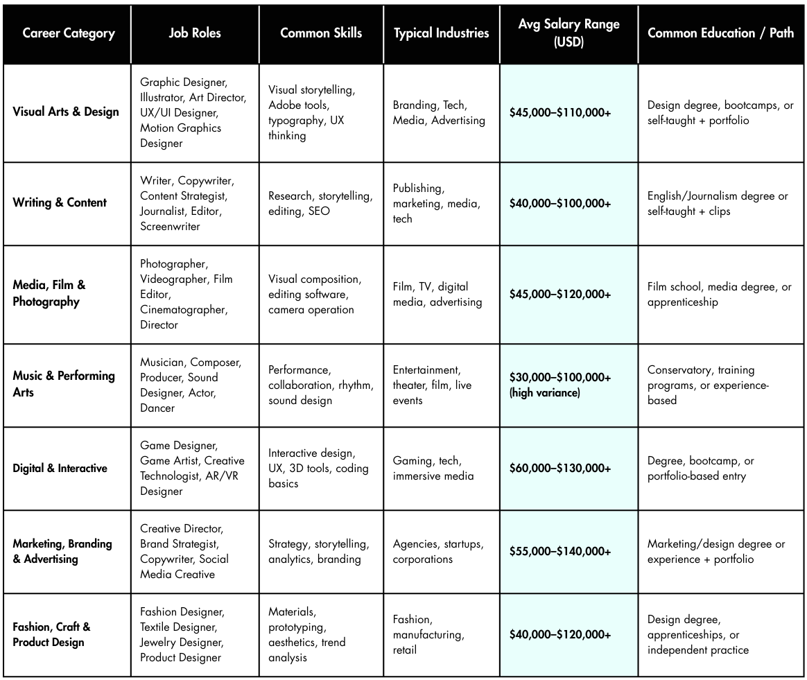 📋 Major Categories of Creative Careers (With Salary & Education Paths)